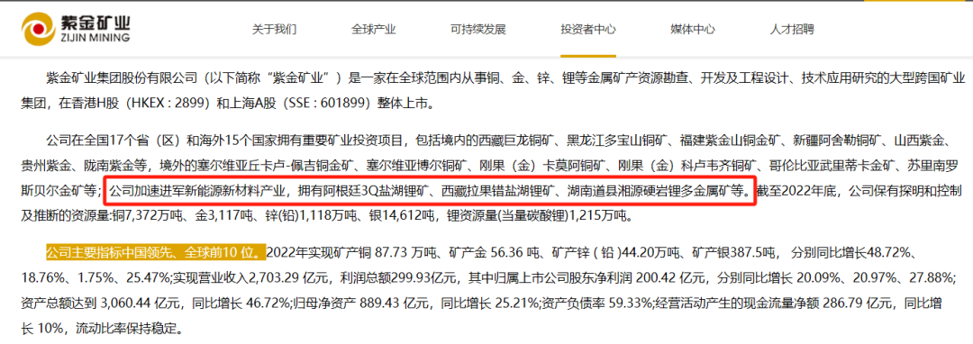 紫金矿业是一家在全球范围内从事铜、金、锌、锂等金属矿产资源勘查、开发及工程设计、技术应用研究的大型跨国矿业集团,主要指标位居全球前10 位,正加速进军新能源新材料产业。