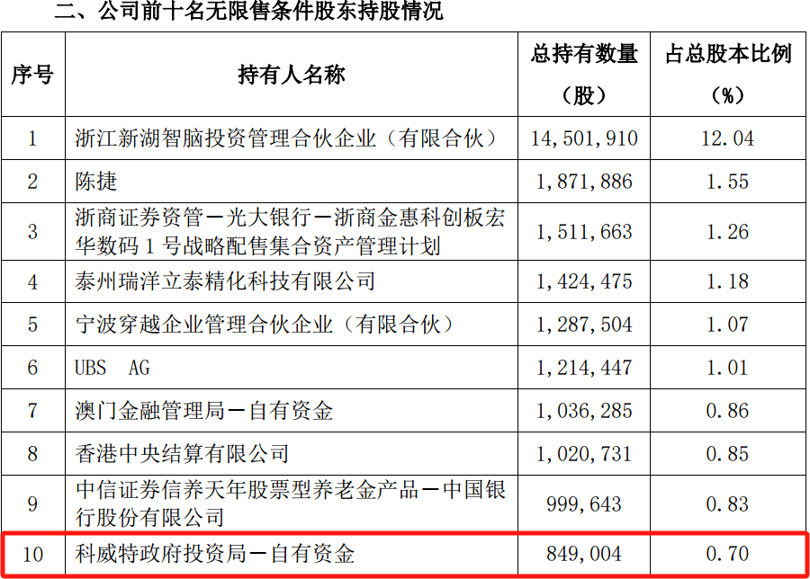 以科创板公司宏华数科为例,10月18日登记在册的前十名无限售条件股东持股情况显示,科威特政府投资局新进成为公司第十大流通股股东,持股数量84.9万股,截至11月3日收盘持股市值0.85亿元。