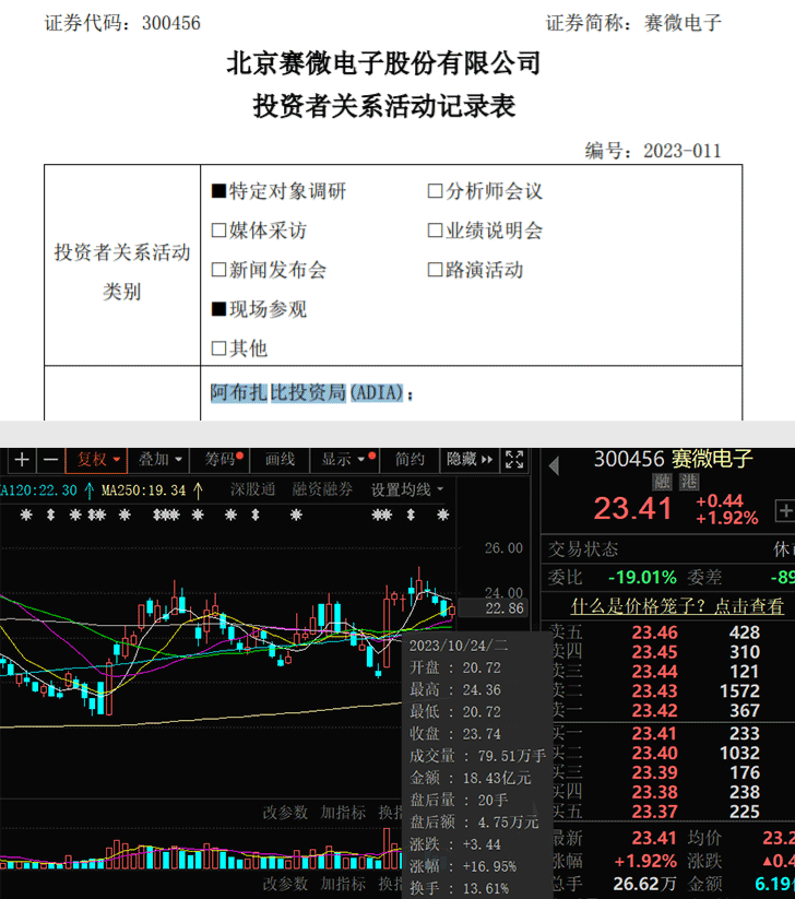 10月24日,阿布达比投资局调研赛微电子,该公司当日一度上涨近17%。