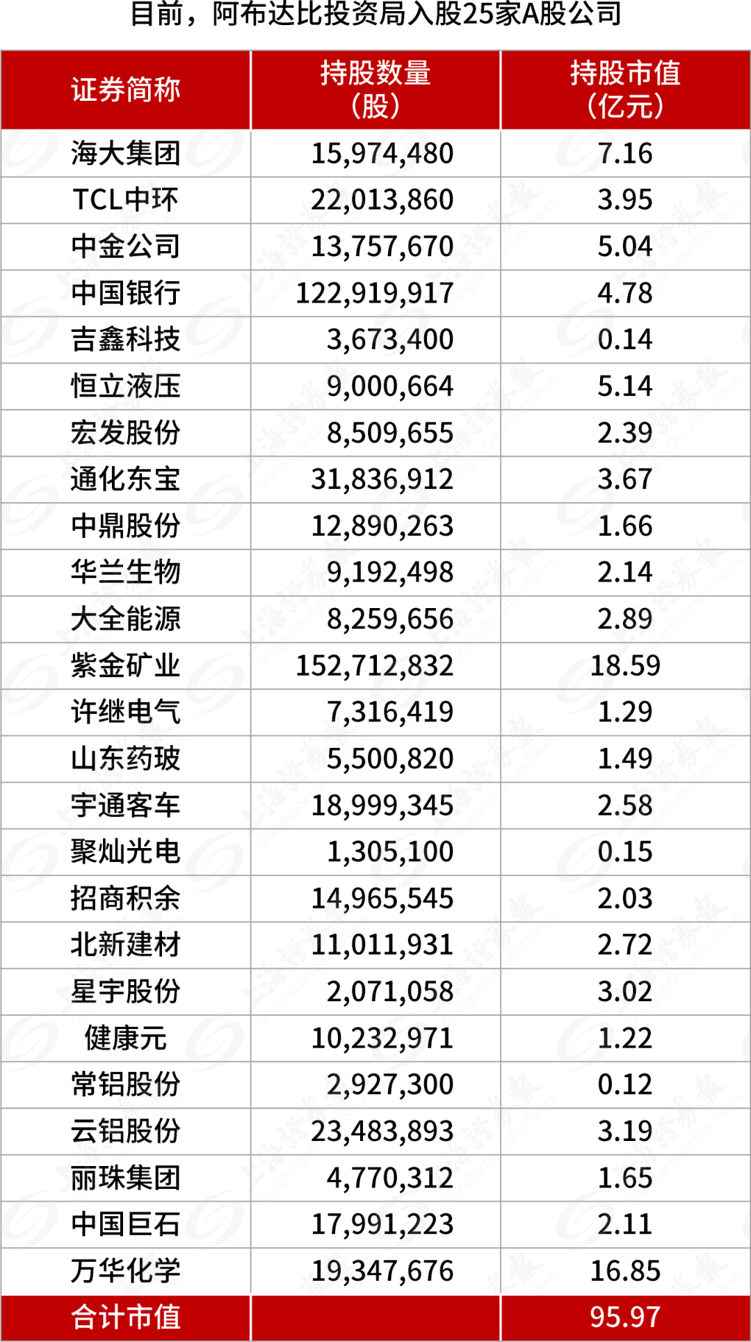 其中,阿布达比投资局的前两大A股重仓股,分别是紫金矿业、万华化学,截至11月3日收盘市值分别为3204亿元、2734亿元。