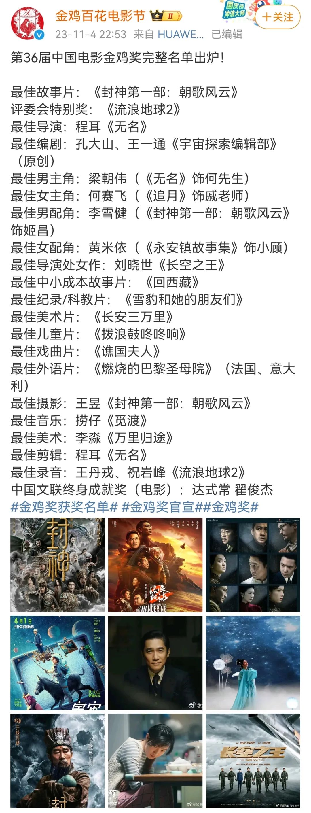 《封神第一部:朝歌风云》获最佳故事片奖,梁朝伟、何赛飞分别获得最佳男主角奖和最佳女主角奖。