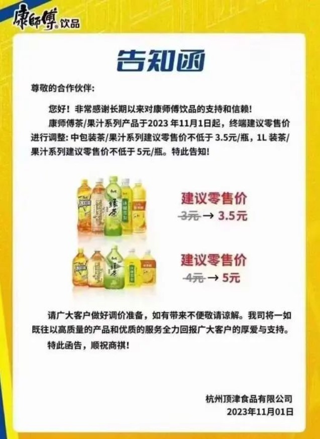 告知函显示,11月1日起,康师傅中包装茶/果汁系列建议零售价从3元/瓶起调整为不低于3.5元/瓶,1L装茶/果汁系列建议零售价从4元/瓶起调整为不低于5元/瓶。