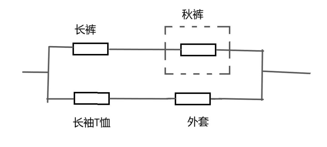 那么换个思路,什么时候需要穿秋裤呢?秋裤的服装热阻是0.14Clo,T恤、外套串联,秋裤、裤子串联,然后再并联。那么可以算出全部这些衣服的总热阻R2=0.17clo/4A。代入公式,得到ΔT=26K,那么对应的外界气温降低到7°C。