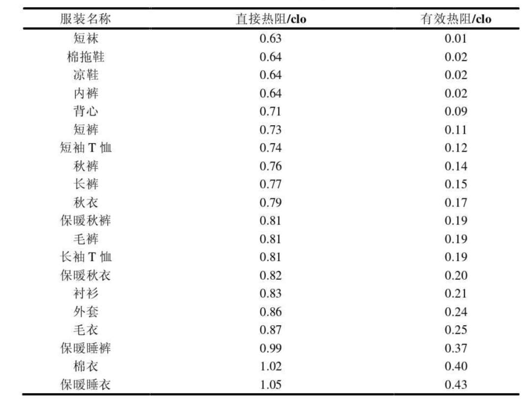 在一般环境中,尤其是偏冷的环境中,服装在维持人体温度方面意义重大。为了定量描述人体和环境之间通过服装进行的换热量,人们提出了“服装热阻”的物理参数,这个热阻与物理上的热阻定义略有不同,是热阻乘上穿衣服的面积。服装热阻的单位为Clo。1Clo=0.155m·K/W。其值越大,衣物的保暖性越好。不同衣服的热阻可以通过多种方法来测量估计,这个量不仅与衣服的材料、制作工艺等等本身条件有关,也会受到环境因素的影响,例如湿度大衣服保暖性能就会差很多。当然我们不可能只穿一件衣服,由于衣服覆盖不到全身,多件衣服叠穿也会对总的热阻有不同的影响。在有效热阻中已经考虑到了这些,总热阻可以按热阻的串联、并联计算。下面给出一些常见服装的热阻: