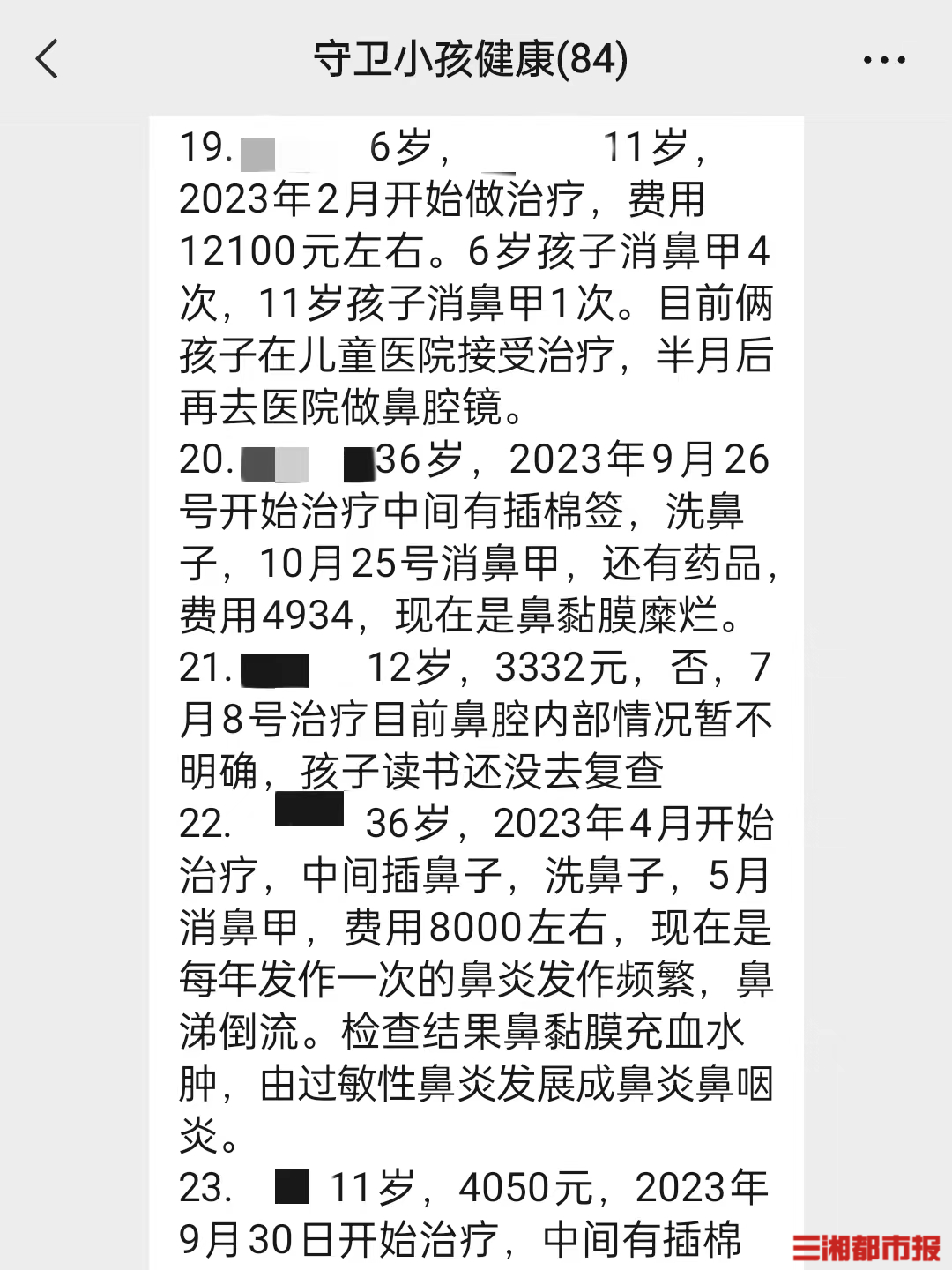 10月29日,三湘都市报记者接到多位市民投诉,称长沙市天心区治未堂中医门诊部唐黎明医生使用不知来源的药品和不合规的治疗方法为孩子治疗鼻炎,导致多名患儿出现鼻腔溃烂等问题。