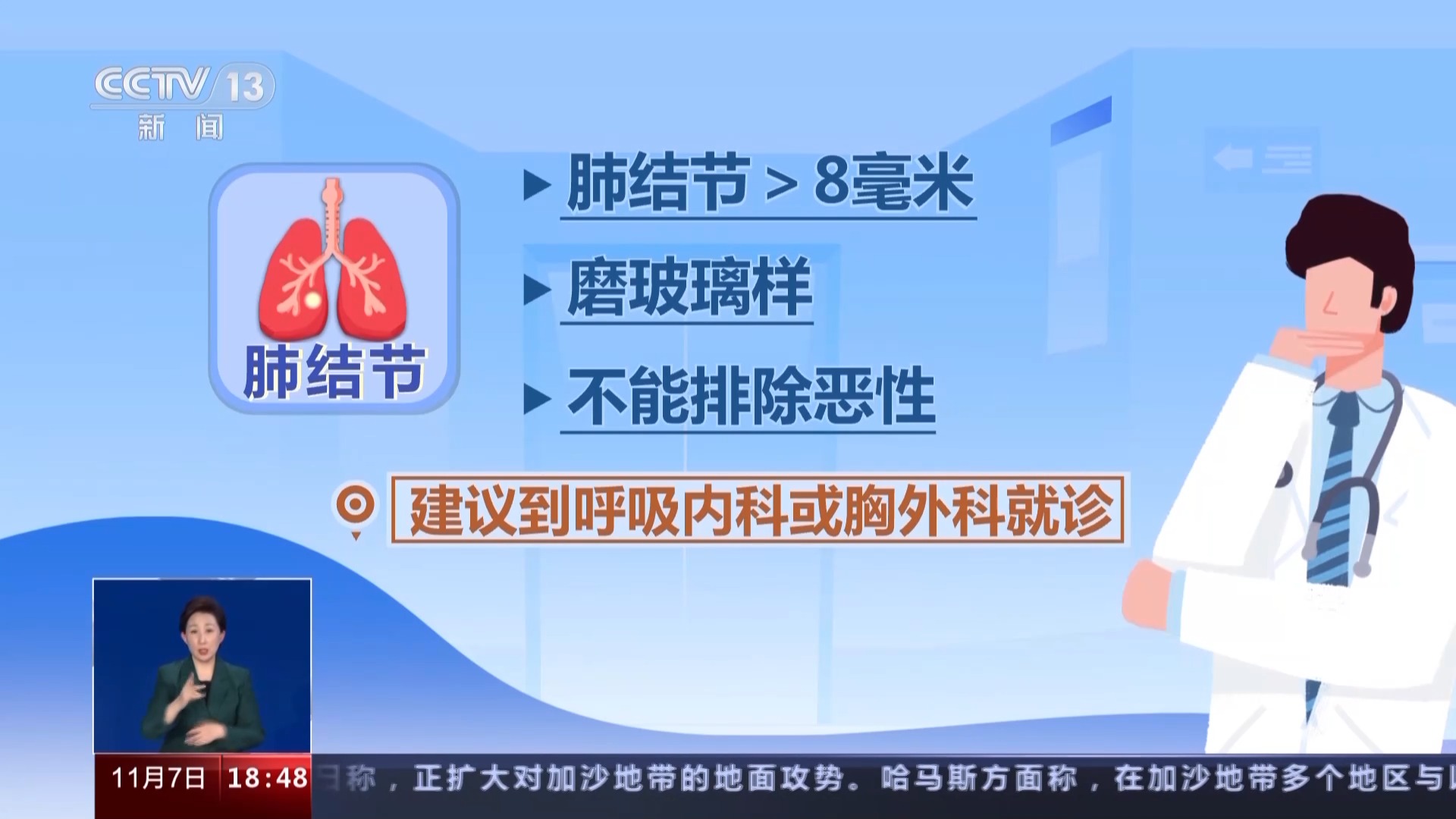 医务人员介绍,肾囊肿、肝囊肿:多数为良性,比较小的肝囊肿、肾囊肿可定期复查超声。当肝囊肿直径≥10厘米或合并感染、出血时,需及时到肝胆外科就诊;肾囊肿伴有症状、直径≥5厘米时,需到泌尿外科就诊。肺结节>8毫米、磨玻璃样、不能排除恶性,建议到呼吸内科或胸外科就诊。