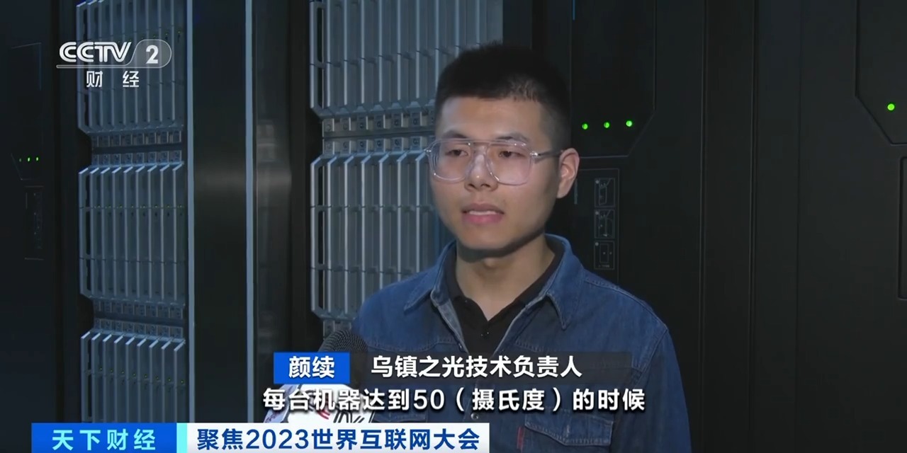 乌镇之光技术负责人 颜续:这边大概有3440台机器,每台机器达到50摄氏度的时候,就会把热量通过冷却技术带走,这种液体比较特殊,抗腐蚀、不导电、沸点比较低。