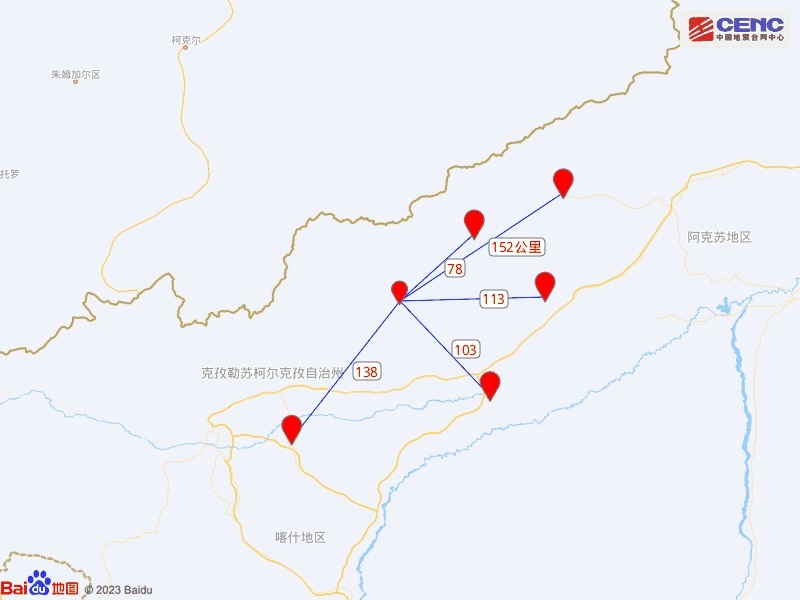 周边县城:震中距阿合奇县78公里、距巴楚县103公里、距柯坪县113公里、距伽师县138公里、距乌什县152公里,距图木舒克市133公里,距乌鲁木齐市897公里。