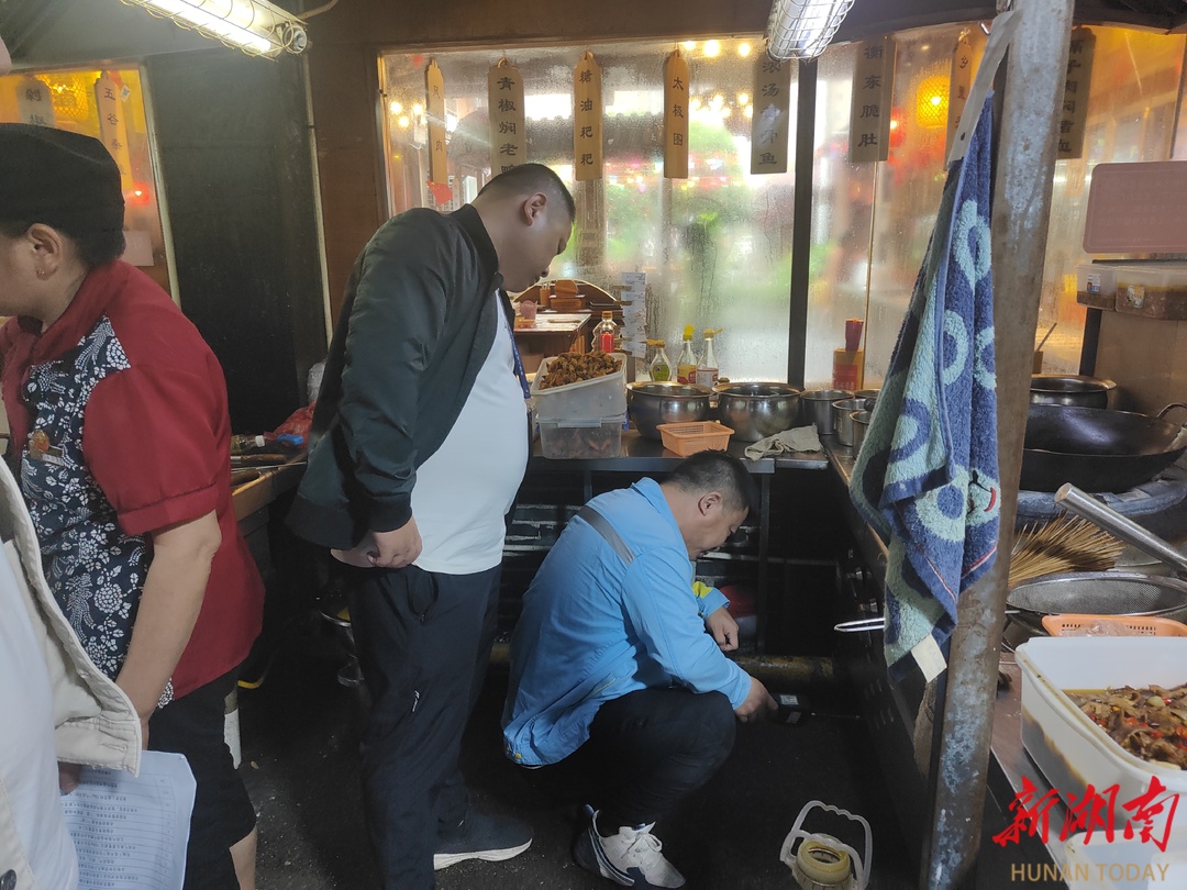 执法人员检查餐饮场所“私接三通”问题隐患,现场进行整改