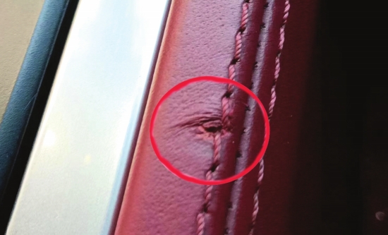 10月23日,曹先生叫代驾后,酒醒后发现车辆挂挡旁的真皮内饰(画圈处)出现指甲盖大小的损坏。