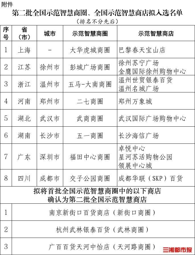 三湘都市报·新湖南客户端11月9日讯(全媒体记者 潘显璇 通讯员 覃昕昱)商务部官网11月8日对第二批全国示范智慧商圈、商店评审结果进行了公示,包括8个全国示范智慧商圈、15个全国示范智慧商店,公示时间为11月8日至12日。其中,长沙市五一商圈入选全国示范智慧商圈,长沙海信广场入选全国示范智慧商店,这也是湖南的商圈、商店首次入选。