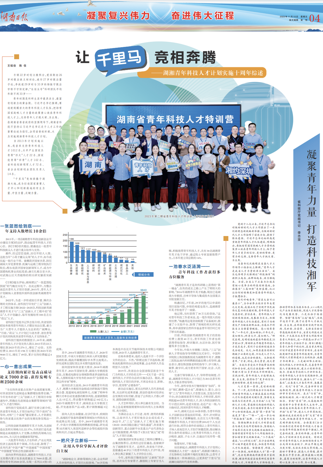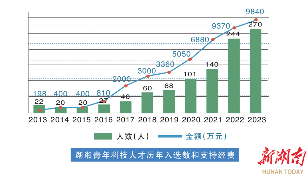 省科技厅提供的数据显示,10年来,湖湘青年科技人才计划支持人数从2013年的22人增长到2023年的270人,增长了12倍。支持经费从2013年的198万元增长到2023年的9840万元,增长了49倍,累计支持经费超过4亿元。
