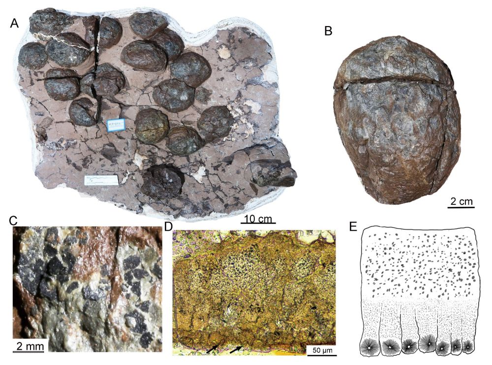 图为守护黔龙的蛋窝和蛋壳结构。A.清理后的恐龙蛋窝;B.一枚保存较完整的守护黔龙蛋;C.蛋壳碎片;蛋壳显微结构(D)和素描图(E)。(韩凤禄供图)