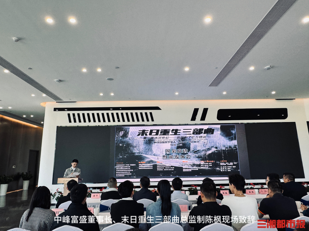 新湖南客户端11月10日讯 电影《末日重生三部曲》第一季冰河世纪新闻发布会11月6日在长沙正式召开,长沙天心经开区党工委委员、长沙天心文化(广告)产业园管委会书记谢巍,中峰富盛投资(中国)控股股份集团董事局主席、董事长陈枫,联合出品人秦贝贝,湖南省中峰富盛控股集团有限责任公司执行总经理、中峰伟瀚(湖南省)影视制作有限公司董事长、《末日重生三部曲》总制片人孙伟,致公党中央文化委委员、文祥公益电影创始人文祥,融发集团董事肖坤,融发集团天祥公司总监汪金武,湖南南辰环保有限公司商务总监、厚德时代(深圳)活动策划有限公司总经理夏子龙,湖南省电影评论协会秘书长王东,长沙谱蓝网络科技有限公司董事长蔡立,海南聚盈实业有限公司董事长胡平出席发布会。