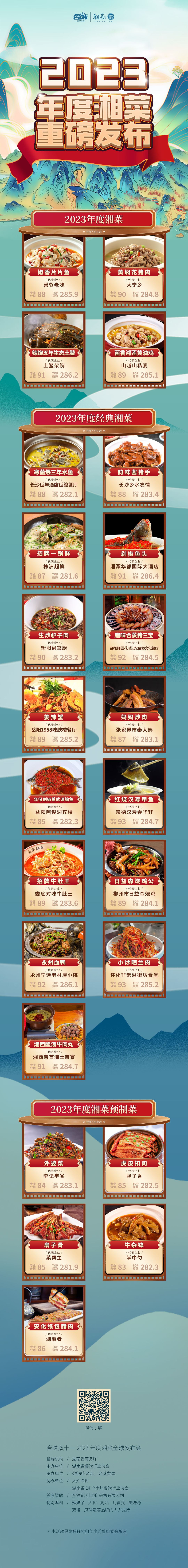 活动组委会经过对湖南整体餐饮市场进行统计分析,结合大数据,从销售量、技术指数、流行趋势、好评率等方面综合考量,评选出4道“2023年度湘菜”,15道“2023年度经典湘菜”,以及5道“2023年度湘菜预制菜”。其中“巢爷老味”的椒香片片鱼、“大宁乡”的黄焖花猪肉、“土鳖柴院”的辣烧五年生态土鳖、“山越山私宴”的菌香湘莲黄油鸡获得“2023年度湘菜”称号。本次活动的一大亮点是“2023年度经典湘菜”覆盖湖南14个地市州,一城一味,三湘大地的特色菜品尽揽其中。