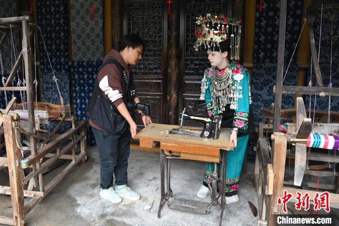 廖文辉为塔季娅娜拍摄苗族服饰照片。记者 杨华峰 摄