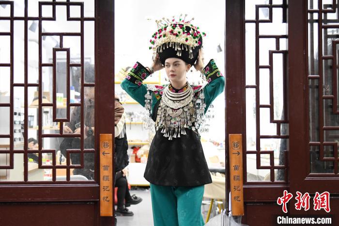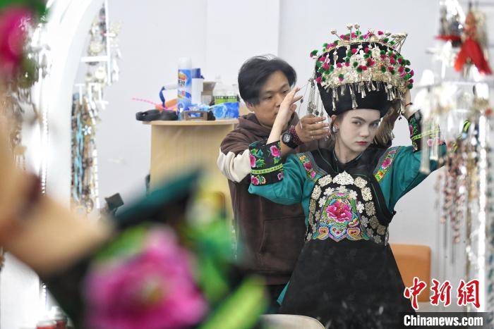 廖文辉为塔季娅娜佩戴苗族头饰。 记者 杨华峰 摄
