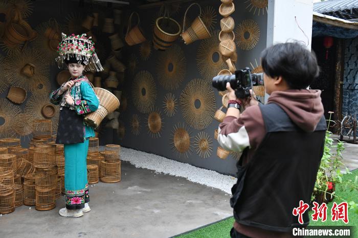 塔季娅娜拍摄苗族服饰照片。记者 杨华峰 摄