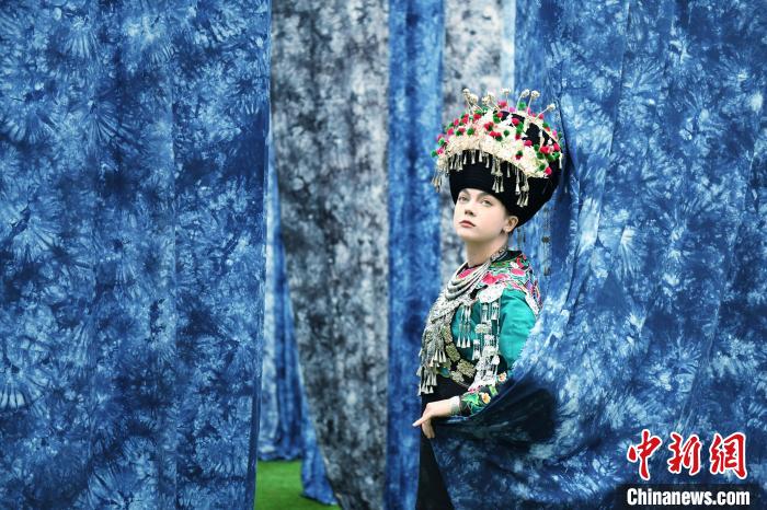 塔季娅娜站在蜡染布中拍摄苗服照片。记者 杨华峰 摄