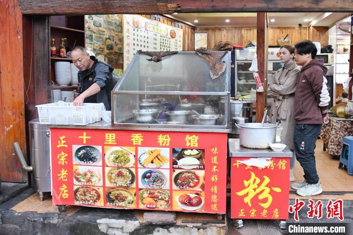 廖文辉与塔季娅娜来到凤凰古城的一家米粉店购买米粉。记者 杨华峰 摄