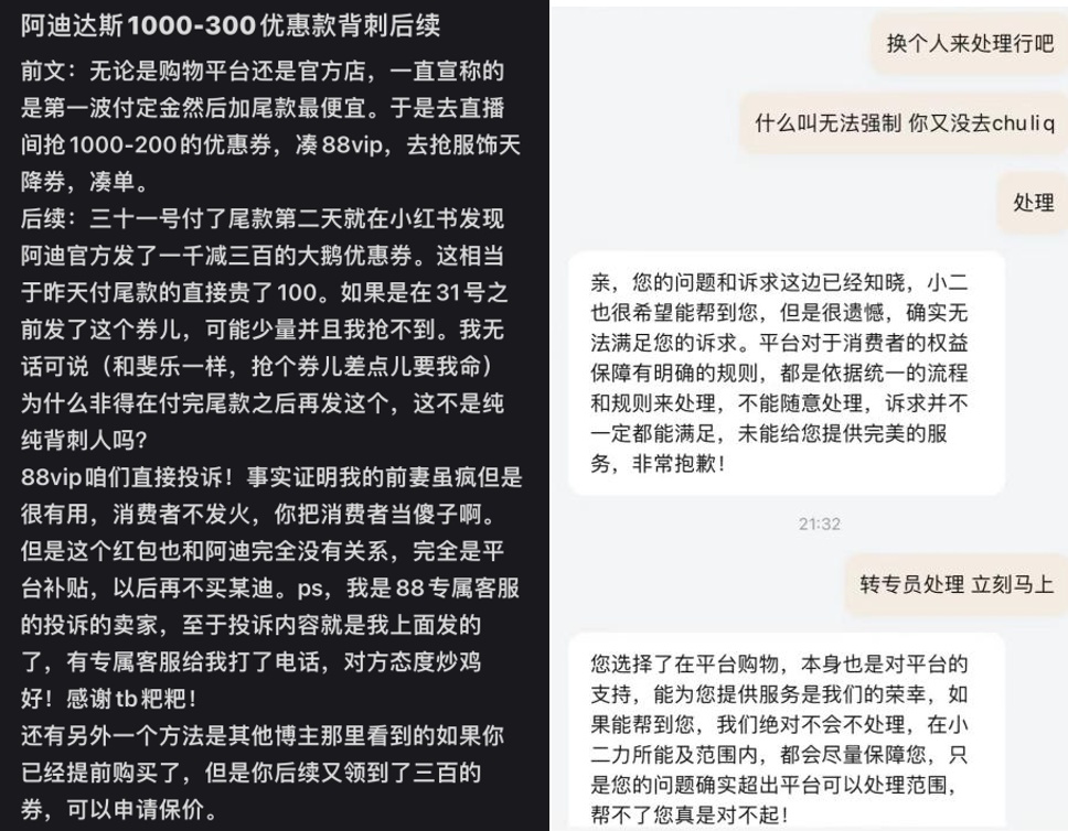 事实上,法治网记者注意到,类似阿迪达斯这种“背刺”消费者的情况也并非孤例。2021年“双十一”期间,美妆品牌巴黎欧莱雅宣称李佳琦直播间的预售是全年最大力度,当时直播间价格为429元50片,经过各类优惠叠加达到368元左右。然而在预售期结束后,巴黎欧莱雅官方旗舰店在11月初发放了几万张999减200的店铺优惠券,再加上各类平台优惠,这款产品最低到手价是257.7元。价差如此之大,一度惹来众怒,消费者联合投诉,最终以品牌方公开道歉并给到优惠券结束这场风波。