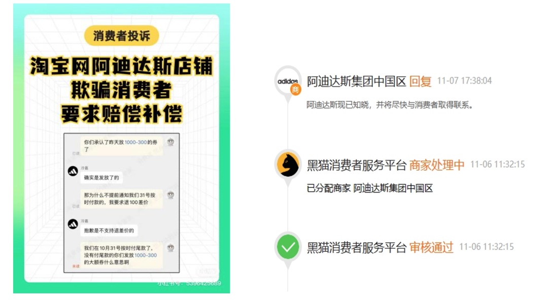 截至目前,阿迪达斯集团仅在黑猫投诉平台上表示已经知晓,正在与消费者联系,暂无其他回应。