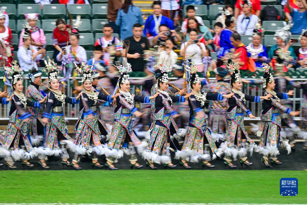 11月11日,贵州榕江“村超”啦啦队在比赛间隙表演民族歌舞。新华社记者 朱炜 摄