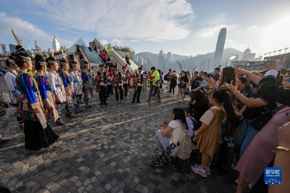 11月10日,贵州榕江“村超”啦啦队的部分成员在香港尖沙咀进行民族服饰快闪表演。新华社记者 朱炜 摄