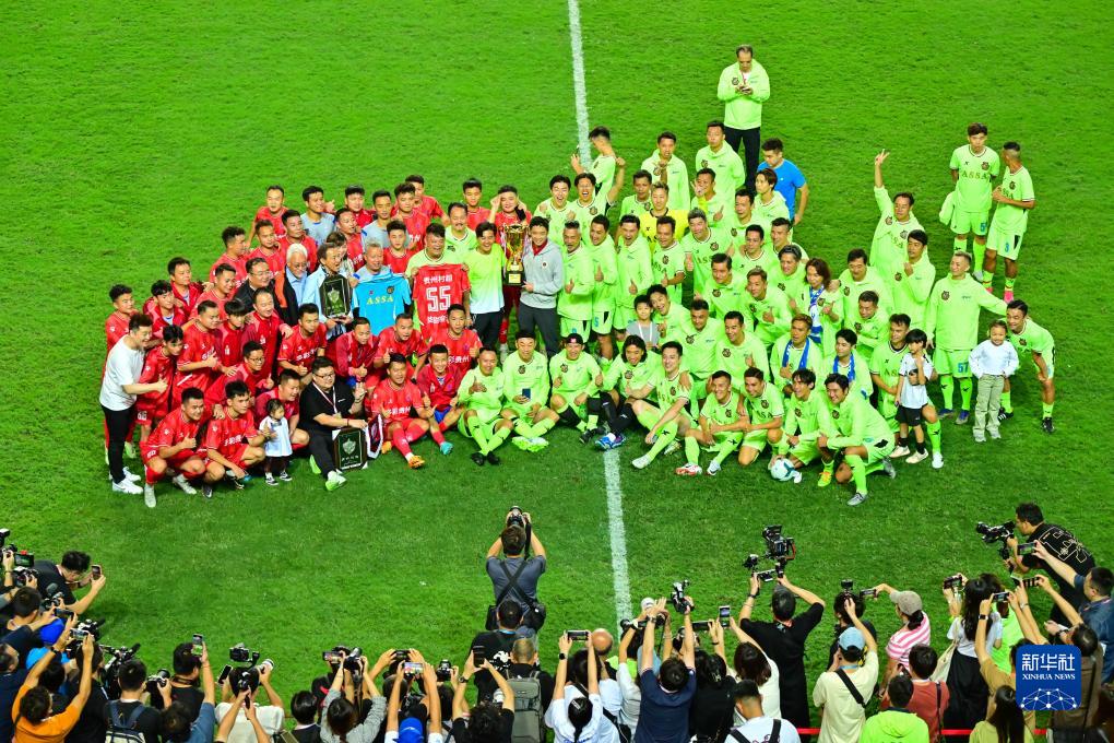 11月11日,贵州榕江“村超”联队与香港明星足球队在比赛后合影。新华社记者 朱炜 摄