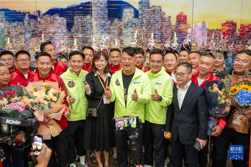 11月10日,香港明星足球队创始成员陈百祥(中)带领队员来到香港西九龙高铁站欢迎贵州榕江代表团。新华社记者 朱炜 摄