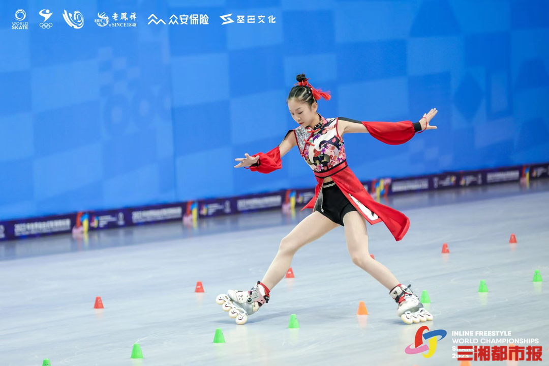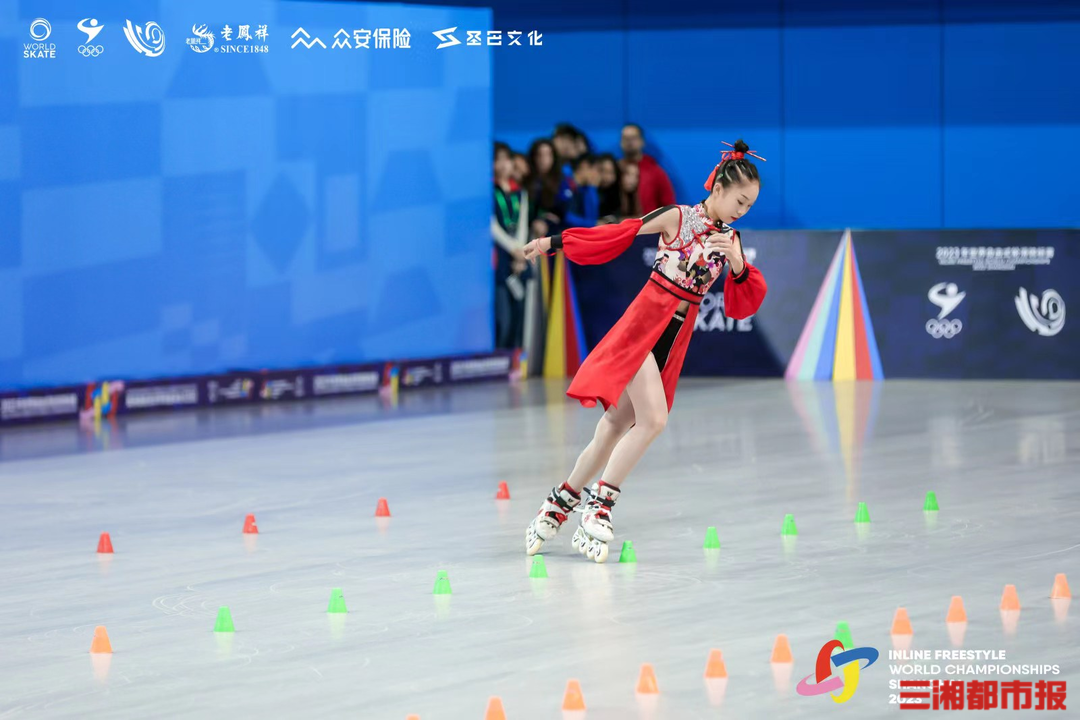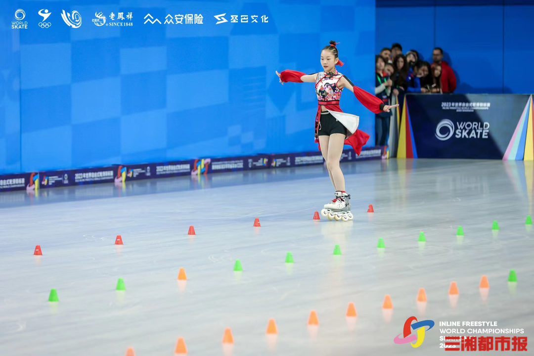 (11月11日,旷宁欣参加2023年自由式轮滑世锦赛青年女子组花式绕桩比赛。受访者供图)