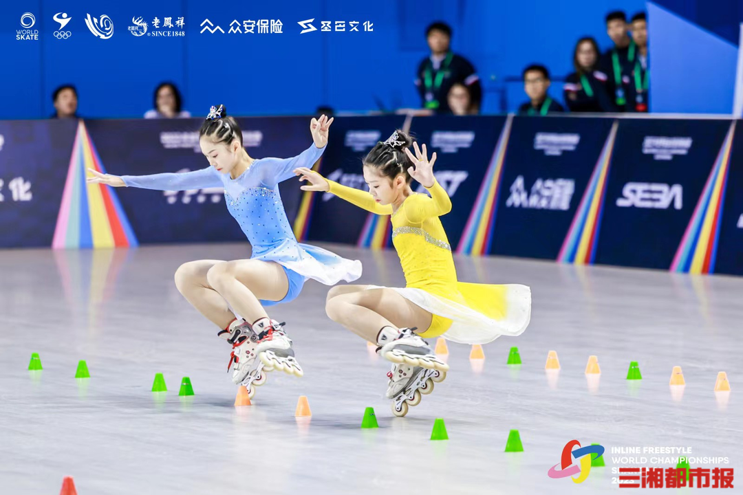 (11月10日,旷宁欣与搭档参加2023年自由式轮滑世锦赛双人花式绕桩比赛中获得冠军,为中国代表队夺得首金。 )