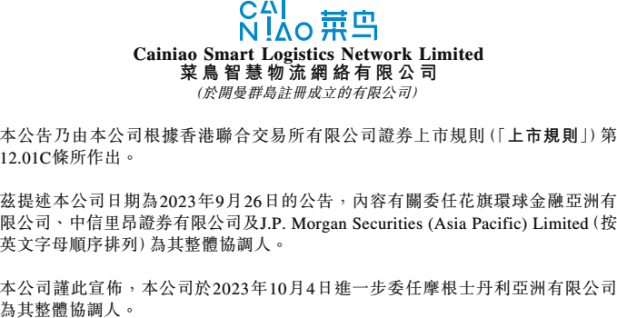 10月4日,菜鸟在港交所公告,在委任花旗环球金融亚洲有限公司、中信证券(香港)有限公司及J.P. Morgan Securities (Asia Pacific) Limited担任联席保荐人兼整体协调人的基础上,进一步委任摩根士丹利亚洲有限公司为其整体协调人。