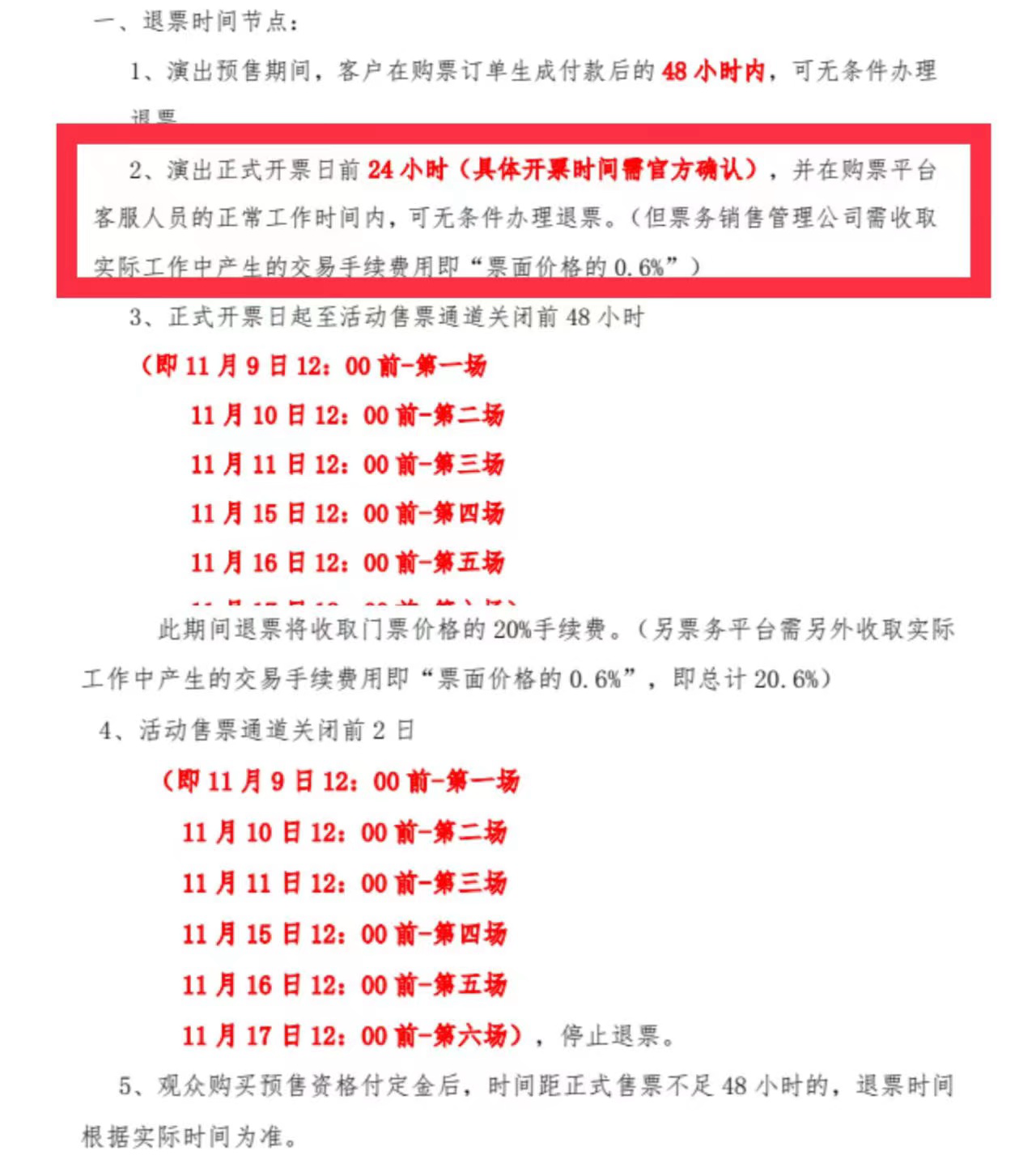 陈奕迅成都演唱会主办方第一次公布的退票规则,要求除了第一天以外其它时间不能退票。