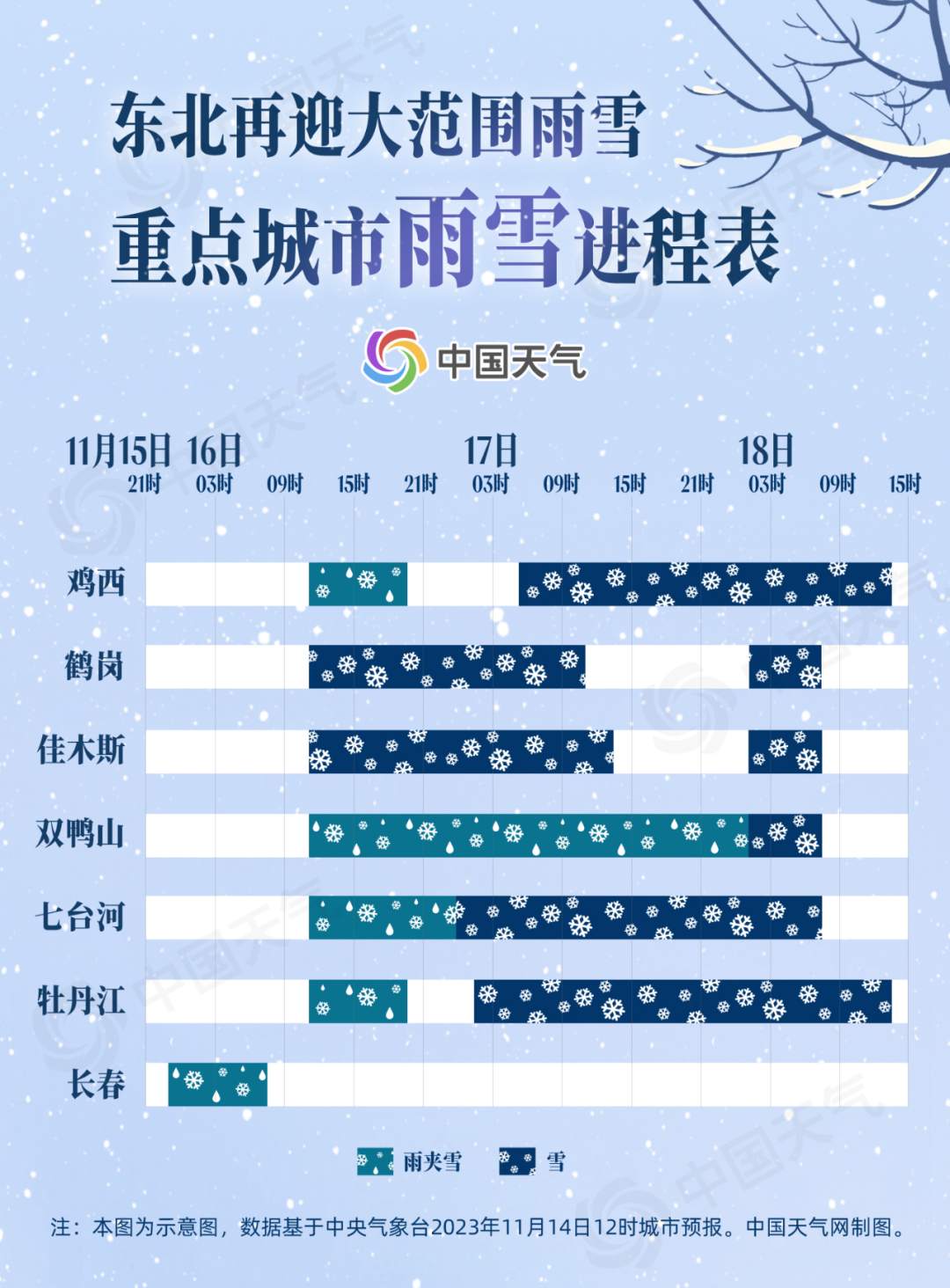 从中国天气网推出的重点城市雨雪进程图来看,大城市中,黑龙江鸡西、鹤岗、佳木斯、双鸭山、七台河和牡丹江等城市的降水将从16日的中午开始,而后逐渐从雨夹雪转纯雪。吉林和辽宁两省则主要以降雨为主,其中吉林长春15日夜间到16日早晨将有雨夹雪现身。