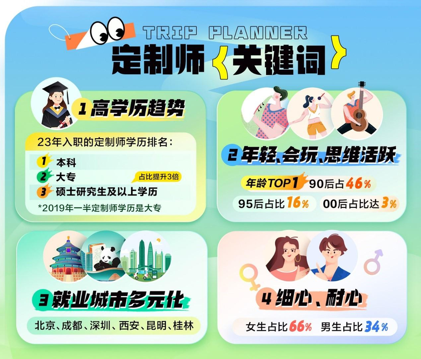 近日,携程发布《2023年携程旅行定制师图鉴》显示,持续繁荣的行业前景、大平台的专业扶持赋能、灵活的工作时间和极有吸引力的收入,成为年轻人加入旅游行业的动力。