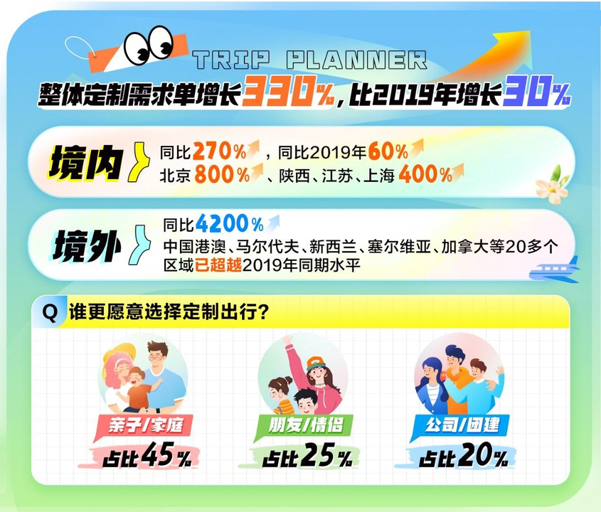 哪类用户更愿意选择定制旅游?携程数据显示,定制游的主要人群是亲子家庭,占45%左右;其次是朋友和情侣出行,占25%左右;在旅行需求趋向多元化、个性化的当下,单身游、银发游也在不断提升。因此,思维活跃、想法大胆、钟爱旅游的年轻人在这里很吃香。