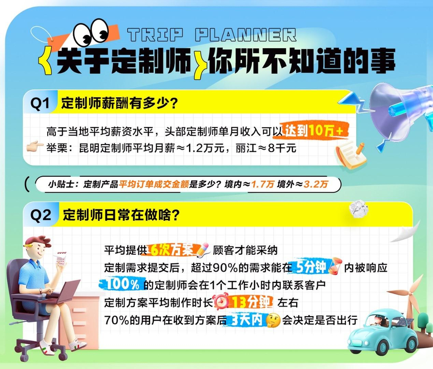 定制师一对一创造性的工作也决定了可观的收入,有头部携程定制师在旺季单月收入可达10万。据《2023届高校毕业生求职抽样调研报告》显示,一线及新一线城市2024届毕业生秋招岗位的平均招聘月薪为6143元,47%的招聘岗位招聘月薪在5K以下。而携程数据显示,根据头部供应商的抽样反馈,以旅游大省云南省为例,昆明的携程定制师的平均月薪在1.2万元左右,丽江在8千元左右。一些头部定制师甚至可以月入8至10万元。定制师可以说是多劳多得的职业,小白定制师通过1至2年的职场训练,就有望在技能和个人收益上获得明显提升。