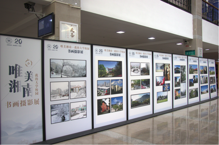 “唯美湘南——我的大学校园”书画摄影作品展在图书馆大厅展出。本次展览共征集到来自学校师生的近百幅书画摄影作品,一幅幅绘画、摄影、书法作品描绘了校园新貌,展示了湘南师生崇德尚艺、积极向上的精神风貌,师生们通过各种艺术方法记录着在湘南学院的点点滴滴,表达着心中那份对学校炽热的情感。部分作品还将于校庆期间在实验大楼前坪展出。
