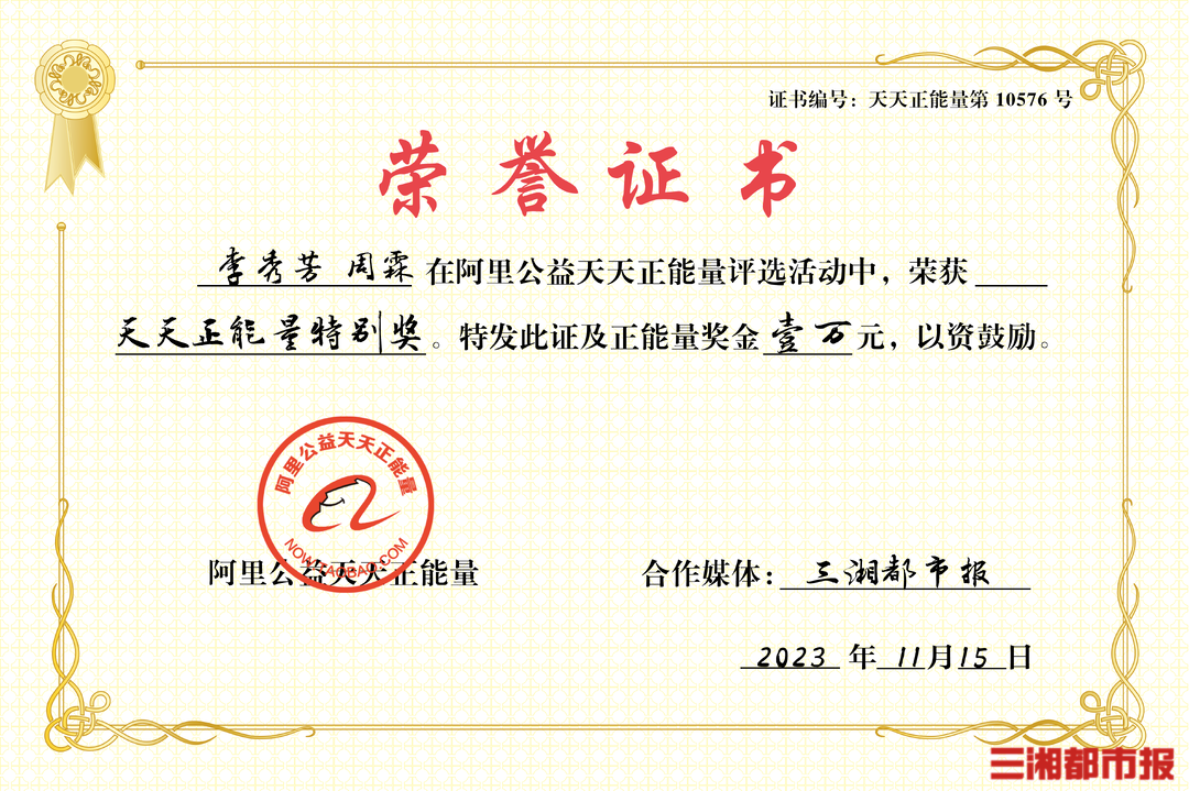 11月15日,三湘都市报联合阿里公益天天正能量为周霖和李秀芳颁发正能量特别奖及万元奖金。