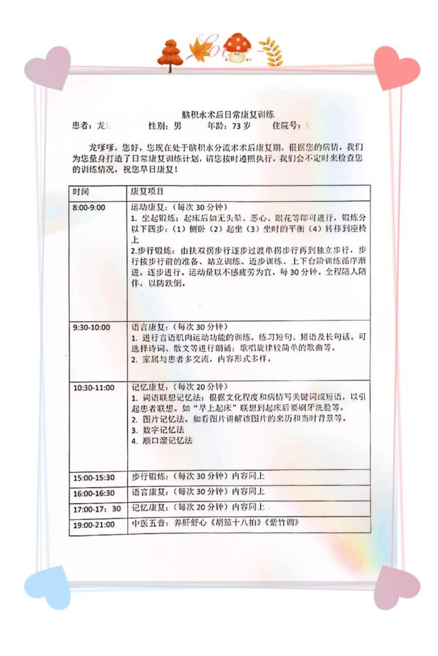 好在经过精准治疗、悉心照料,老人情况逐渐好转。为了帮助老人更好地康复,在他出院时,医护人员还特别为他精心制作了一张图文并茂、一看就懂的“日常康复训练计划表”,方便其回家后按时按规进行康复训练。