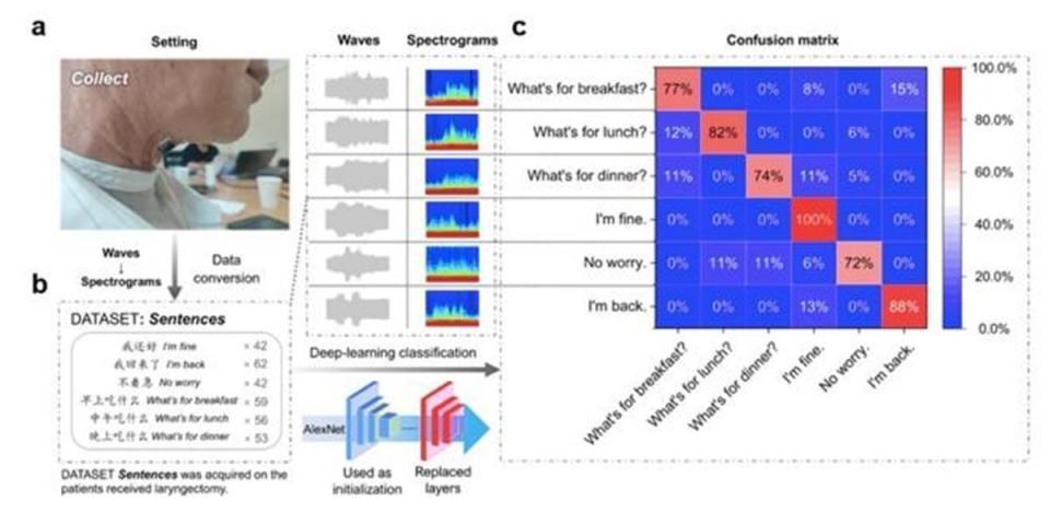 使用智能可穿戴人工喉进行无声语音交互 图源:清华大学