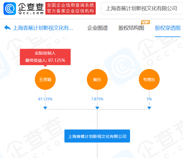 通过查阅企查查股权穿透显示,王思聪持有该公司87.13%股份并担任监事。