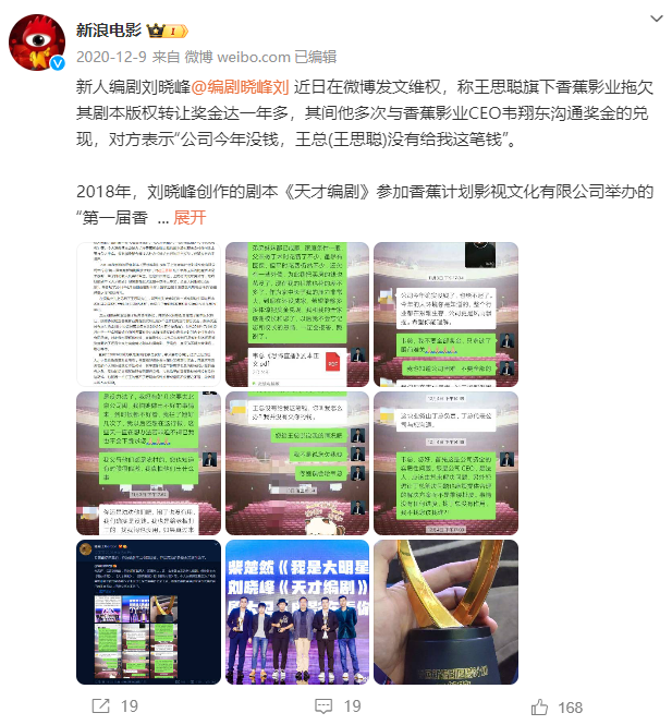 2020年12月7日,编剧刘晓峰通过社交媒体发文,公开向王思聪讨薪,称自己被王思聪的香蕉影业拖欠80万版权费。其间他多次与香蕉影业CEO韦翔东沟通奖金的兑现,对方表示“公司今年没钱,王总(王思聪)没有给我这笔钱”。