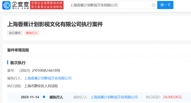 据企查查信息,11月14日,上海香蕉计划影视文化有限公司新增一则被执行人信息,执行标的2.4万元,执行法院为上海市静安区人民法院。