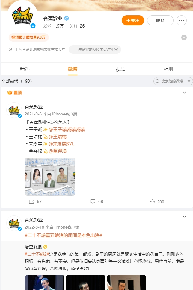 截至发稿,香蕉影业微博已超过1年未更新,其官方微信已接近2年未更新。
