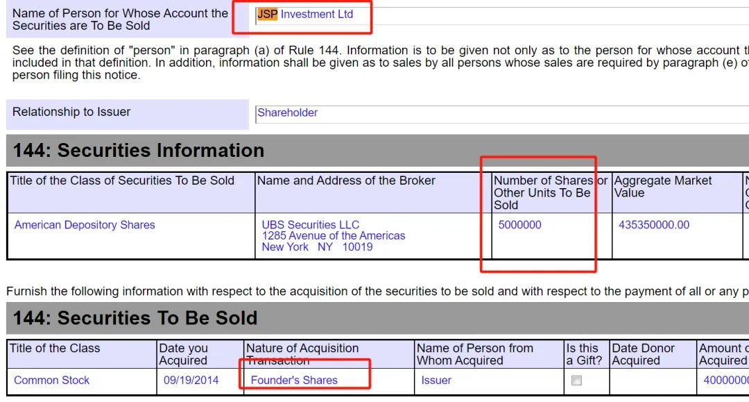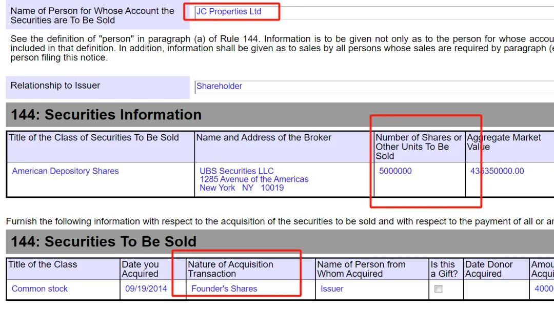 11月16日消息,据美国证交会(SEC)官网披露的F144文件显示,马云家族信托JC Properties Limited(一家英属维尔京群岛公司)和JSP Investment Limited(一家英属维尔京群岛公司)拟于11月21日分别减持500万股阿里巴巴创始人股份。