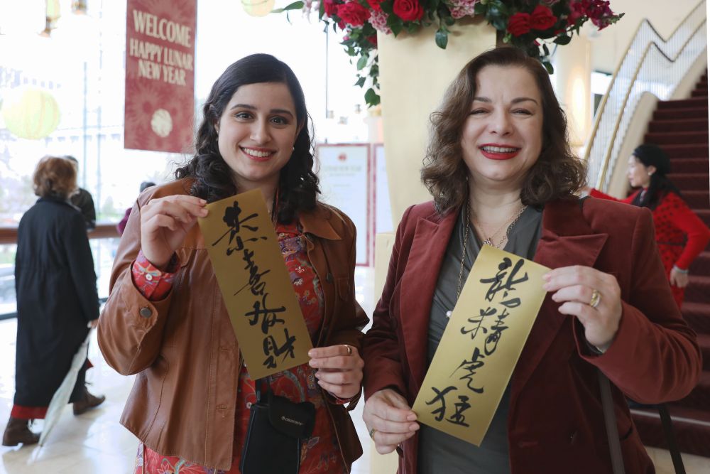 2023年2月5日,在美国旧金山戴维斯音乐厅,两名欣赏中国农历新年音乐会的观众展示福帖。新华社发(刘艺霖摄)