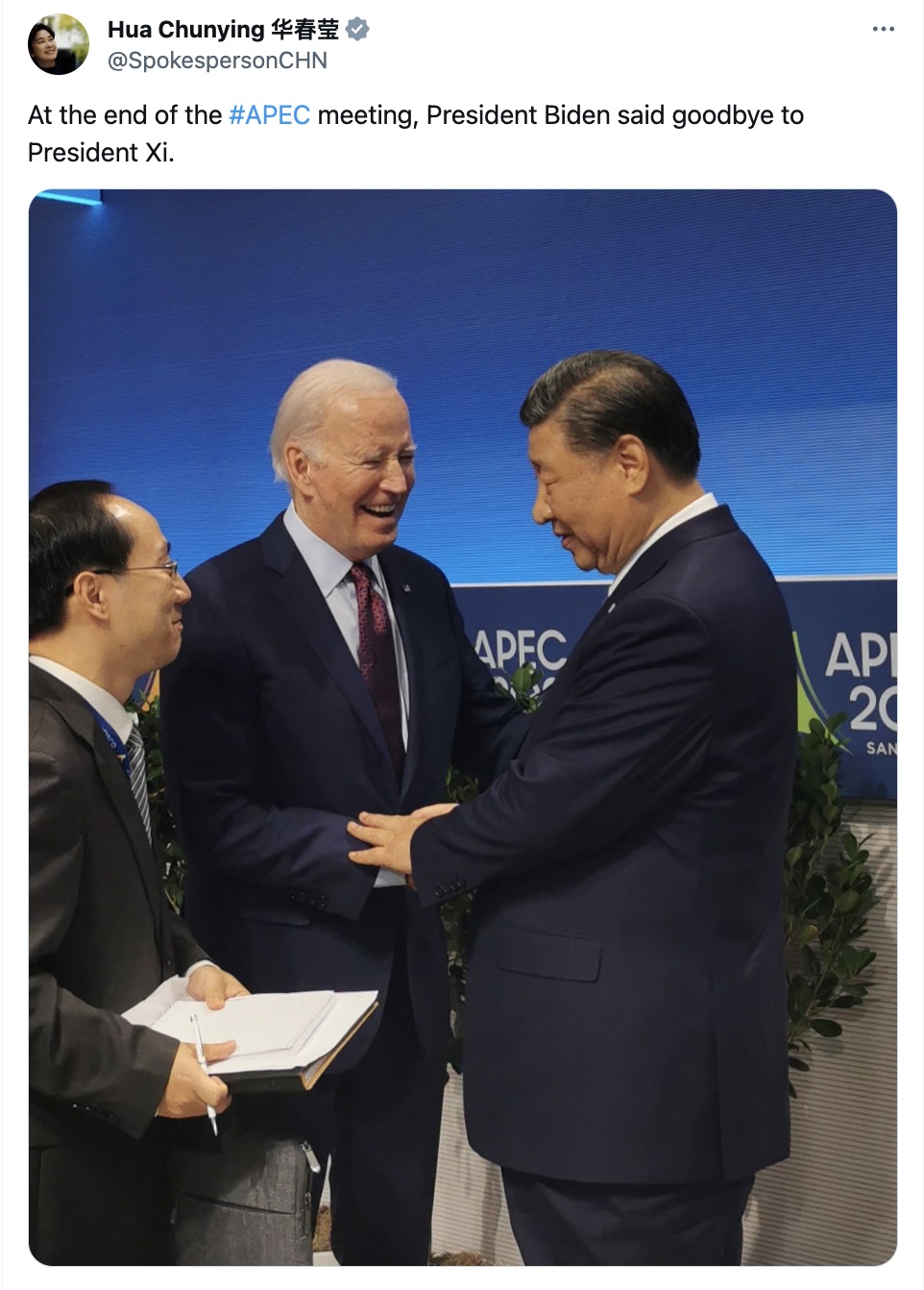 美国旧金山当地时间17日,亚太经合组织(APEC)第三十次领导人非正式会议结束时,美国总统拜登与国家主席习近平话别。