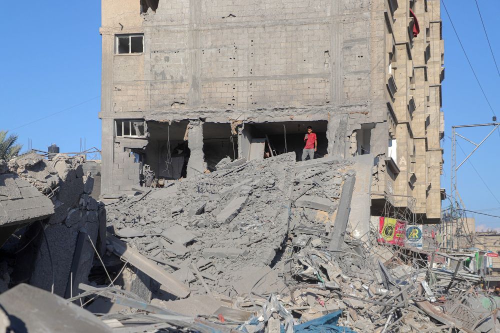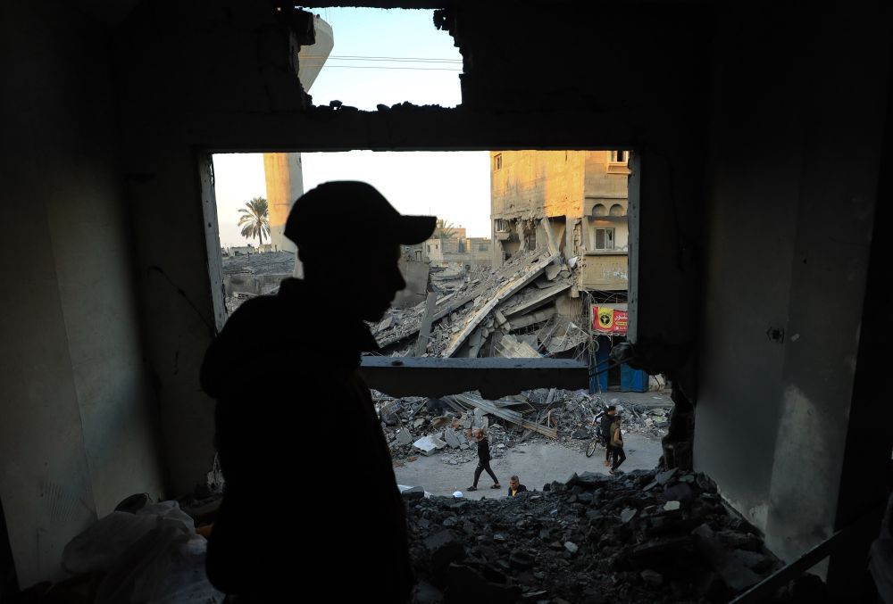 11月17日,在加沙地带南部城市汗尤尼斯,一名男子查看遭以色列袭击后的建筑废墟。新华社发(亚西尔·库迪摄)